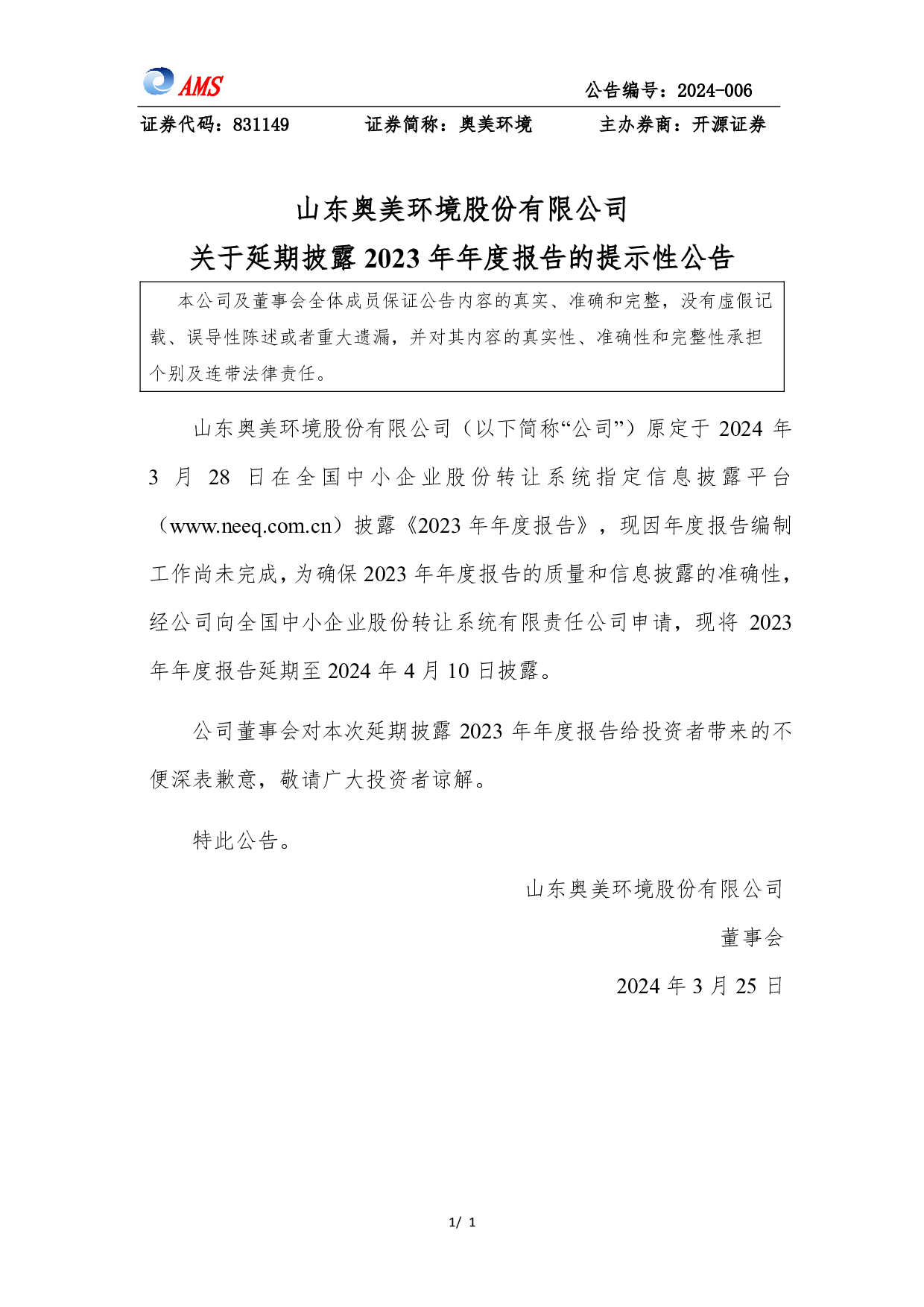 山东奥美环境股份有限公司 关于延期披露 2023 年年度报告的提示性公告【2024-006】