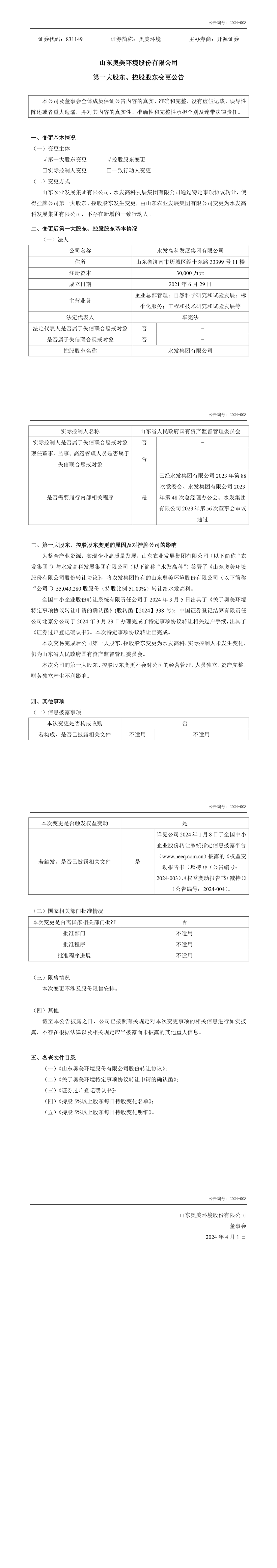 山东奥美环境股份有限公司 第一大股东、控股股东变更公告【2024-008】