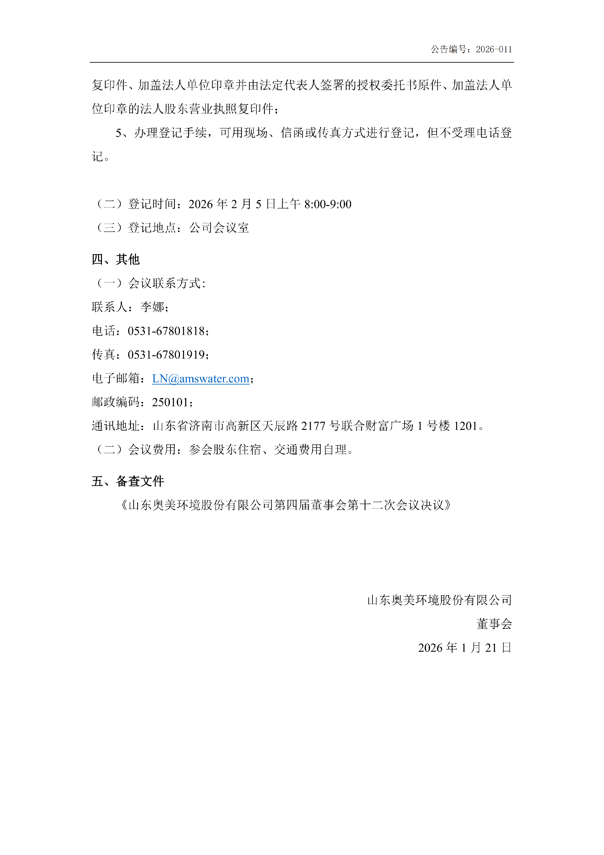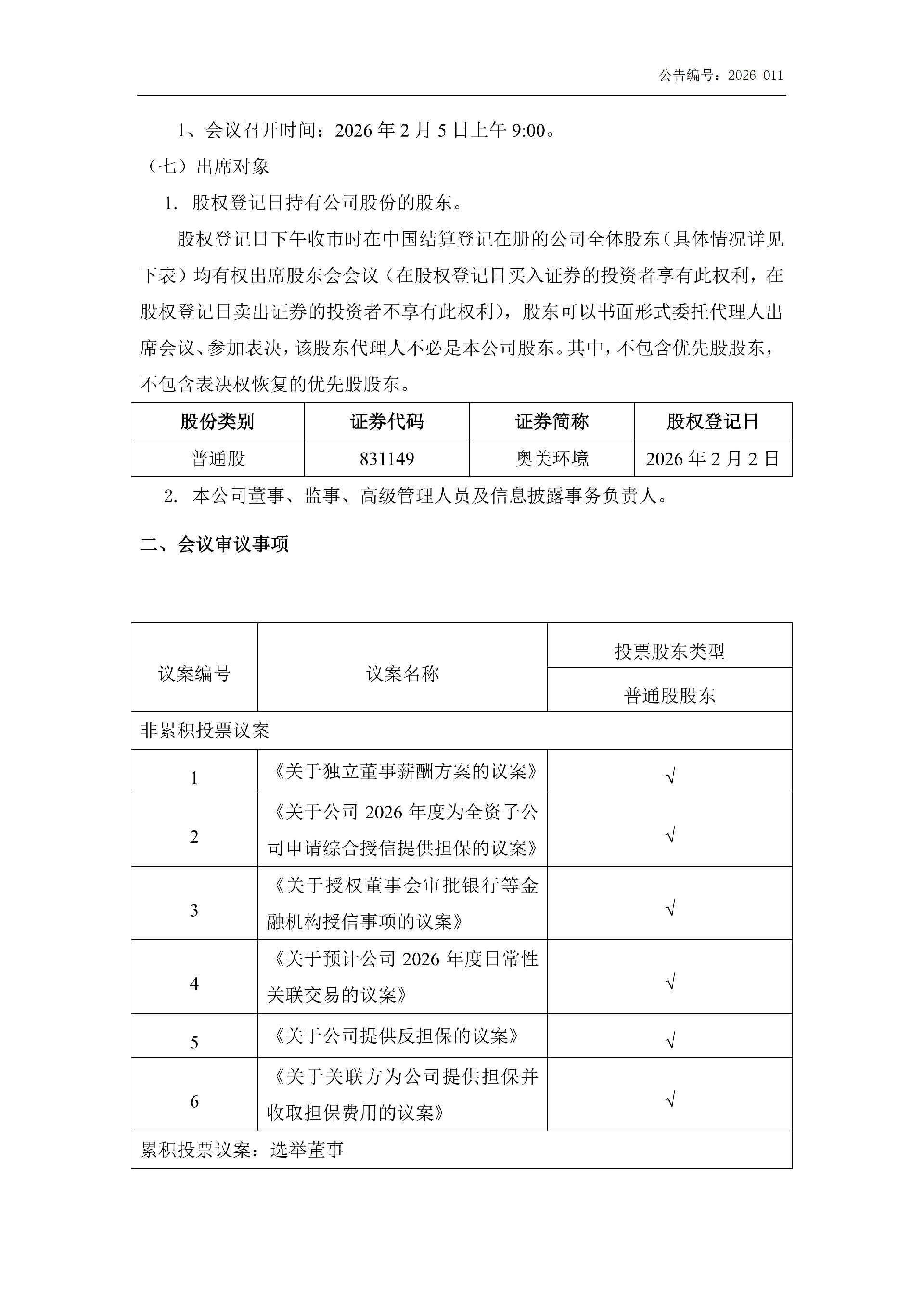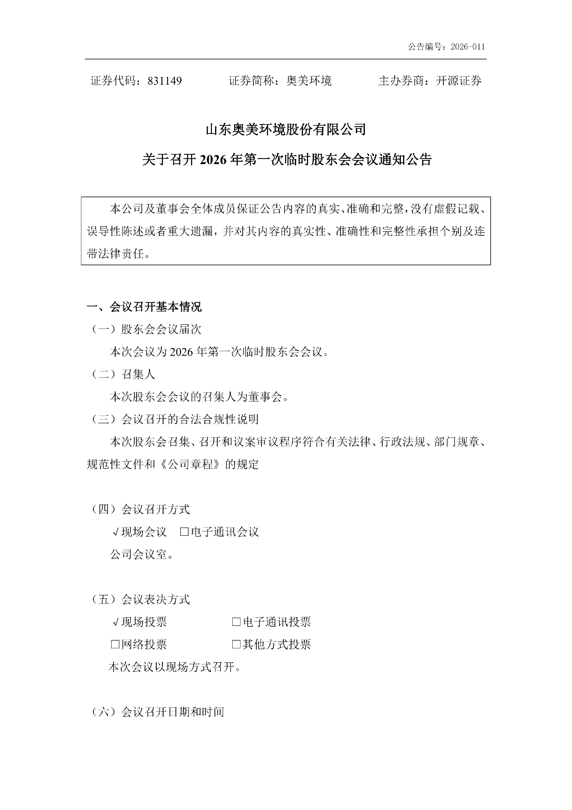 山东奥美环境股份有限公司关于召开 2026 年第一次临时股东会会议通知公告